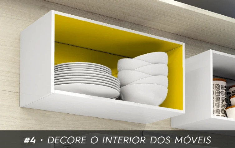 Falando em pintura, que tal ousar um pouco? Geralmente, a parte de dentro dos móveis não recebe muita atenção na hora da decoração. Uma boa dica para quem quer renovar o ambiente gastando pouco é mudar a cor das superfícies internas de armários, nichos e prateleiras. Você pode fazer isso com tinta ou até com papel contact. Essa mudança pode parecer pequena, mas é um ótimo jeito de quebrar a monotonia.